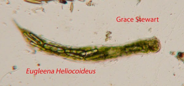 6. Eugleena Heliocoideus- Alright, I misspelt it again. I must have been out of it that particular lab... Anyways. This protozoa has popped up before, and I snagged a picture of it again to show that it had popped up. At least two were spotted, though I only got a picture of one this time. This organism can be identified in a certain algae book I didn't remember (I'll fix it later, I promise), page 283 and figure 386. It doesn't really move.